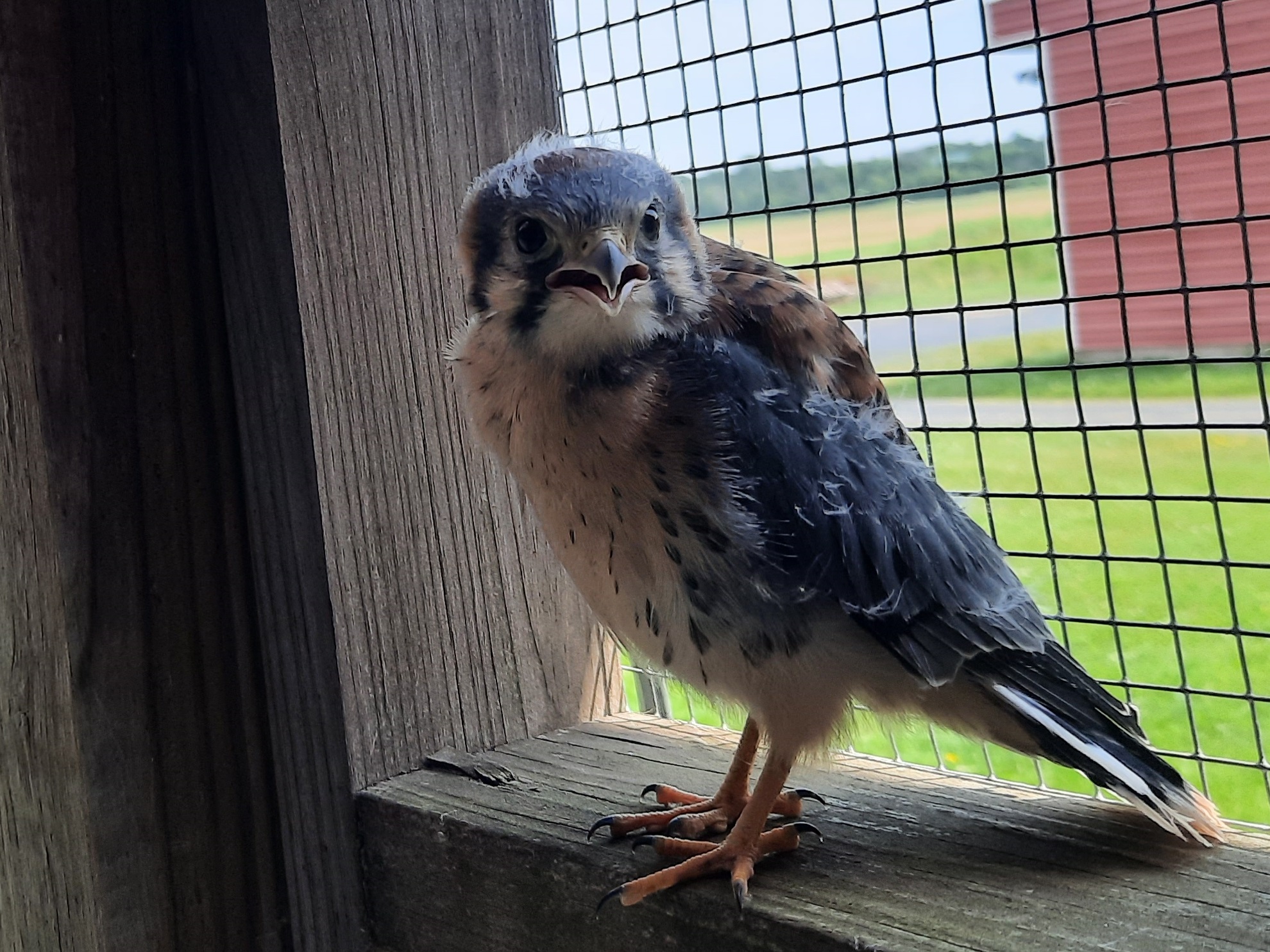 Nonetheless, we got our kestrels! Apparently, a couple decided that our barn’s outbuildings had just the right type of cavity for nesting. So fledgling kestrels, with adult colors, but still with bits of fluff, started showing up — hopping around our farm road and in the shop, where we work on equipment. The two kestrels in our shop we captured and relocated to our chicken run, where the cat wouldn’t be able to get them.