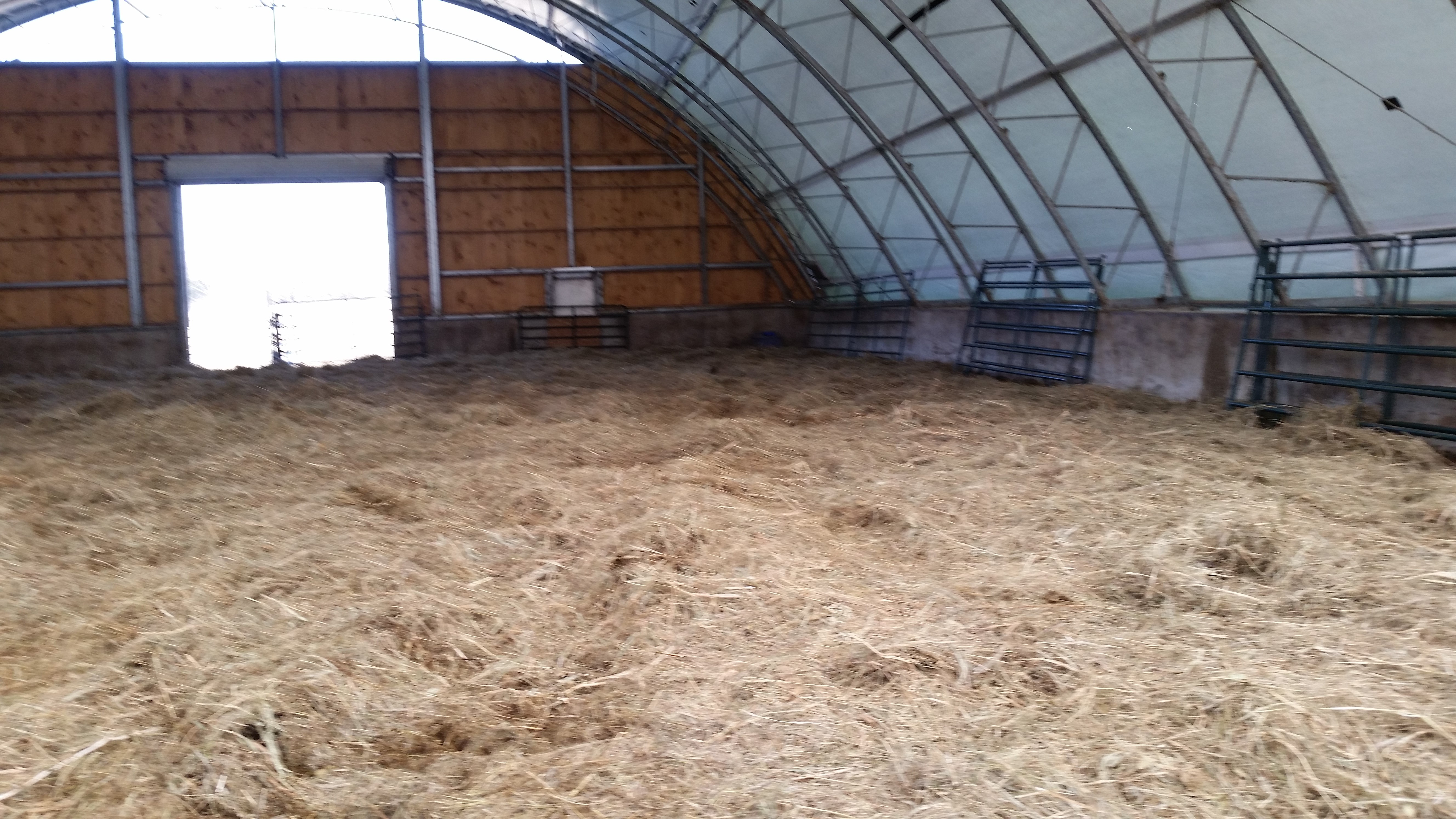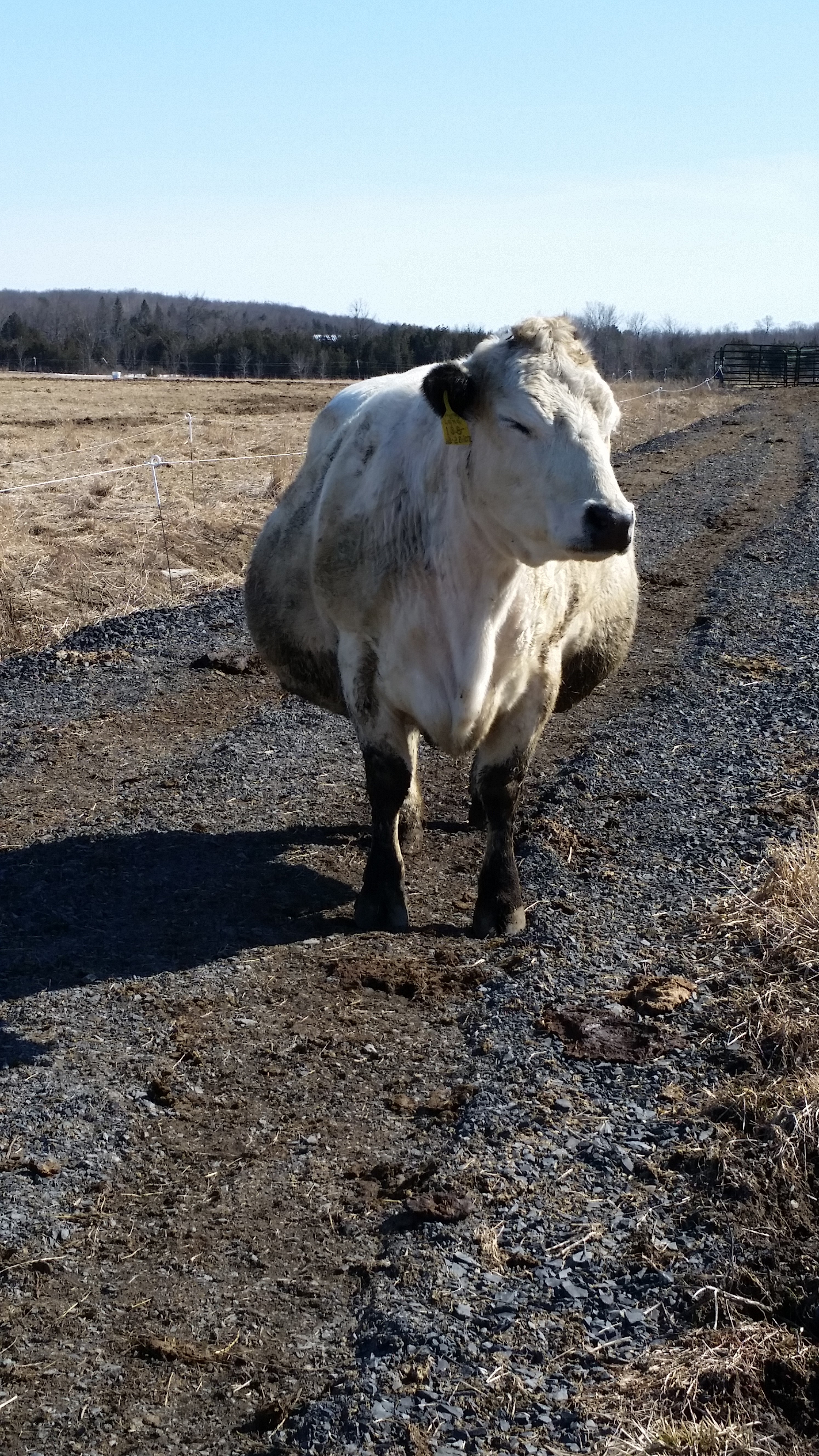 We just shredded a couple more round bales of bedding hay to prepare a comfy spot for our pregnant cows to give birth. So soft and fluffy to lie on! Here’s our Lena, a very pregnant cow, welcoming the return of the sun and waiting for her calf to be born. We’re expecting 10 calves very, very soon. The other cows are eating hay.