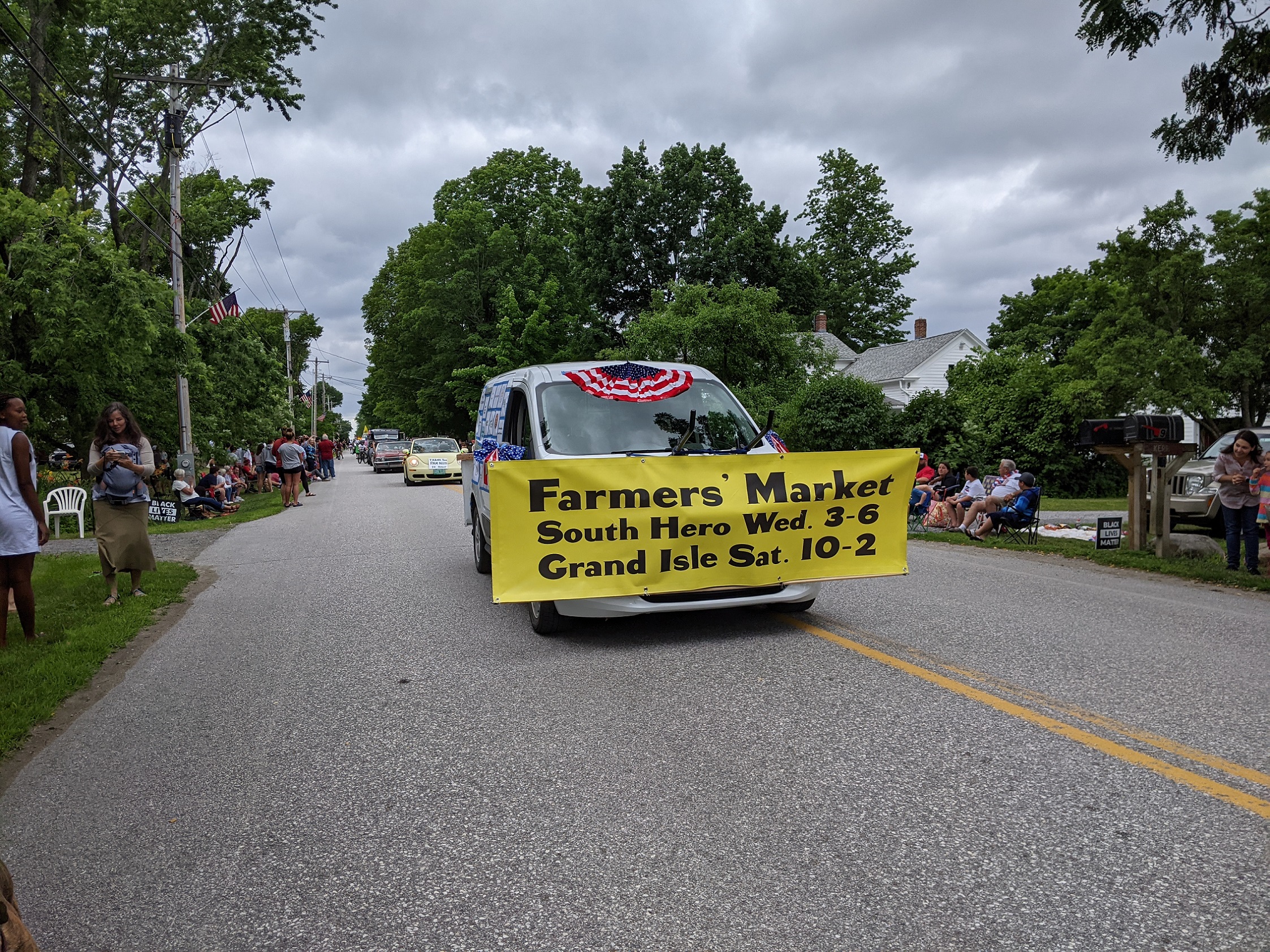 South Hero celebrates independence day with a parade down South Street. This year’s theme was “essential workers”, so our Farmers’ Market needed to be represented! Our farmers worked hard last year to produce food for the community and sell it at the market. Here’s Joan driving our farm van with the farmers’ market’s banner. On one side of the van, we display the vendors logos; and on the other side, we thank our community sponsors! [photo credits: Bob Fireovid, Rob Swanson and Liz Monley]