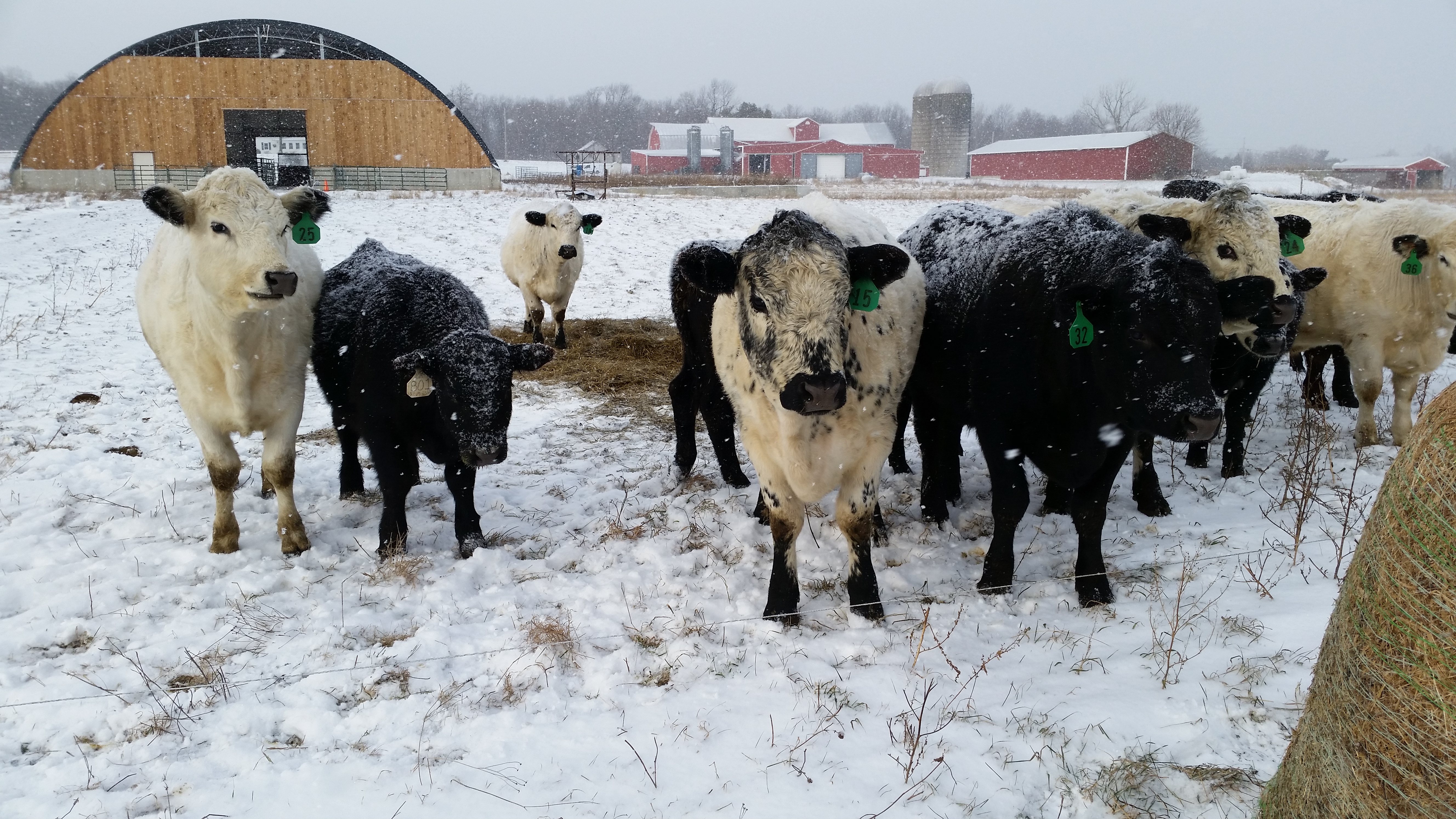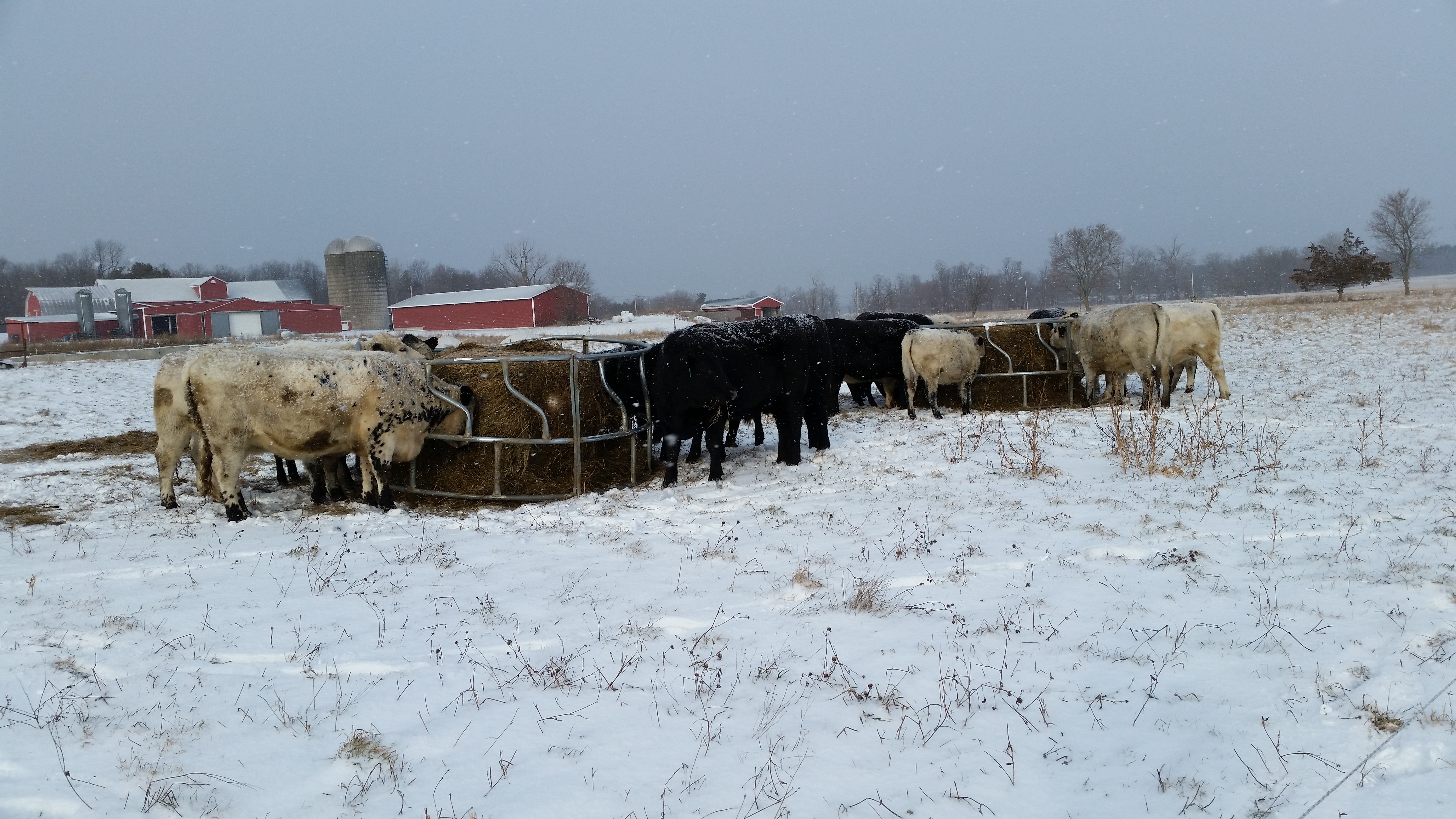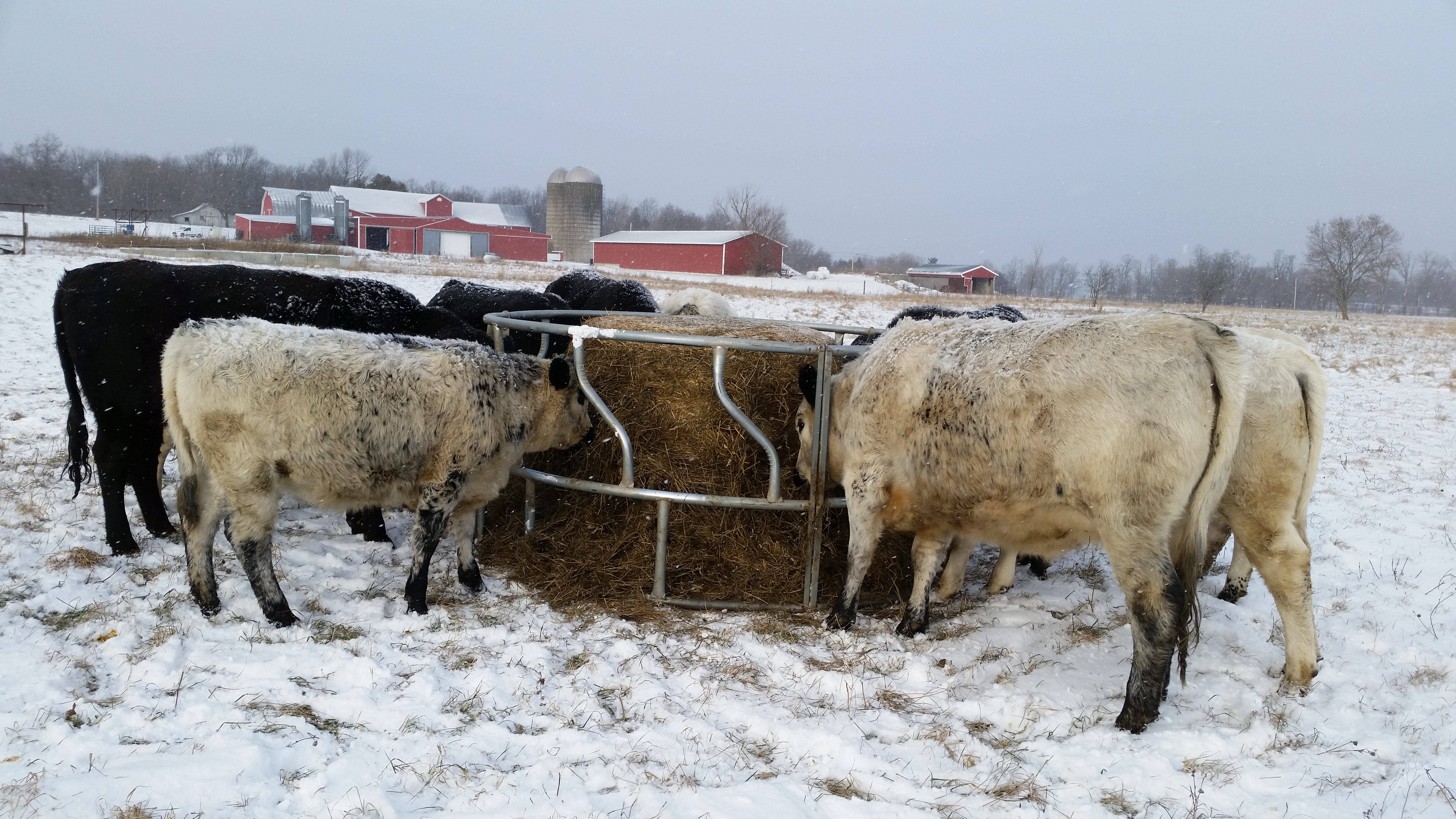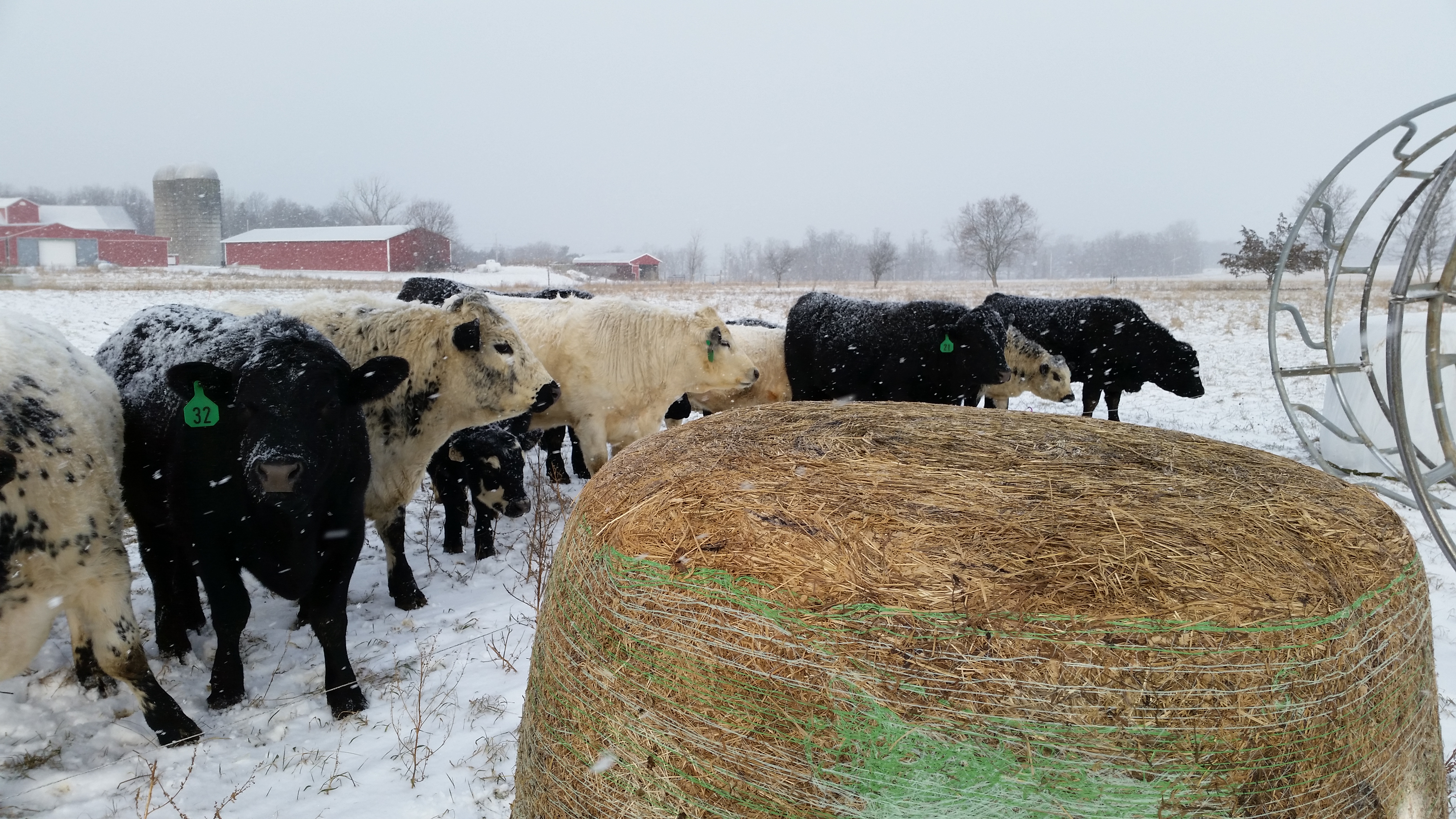 In the winter, we feed out the bales we worked so hard to make in the spring. Last May we mowed the grass and then baled it while the moisture was about 50%. We then wrapped it in plastic to set up fermentation, thus enhancing the nutritional value. Probiotics, energy and protein all in one large bale.